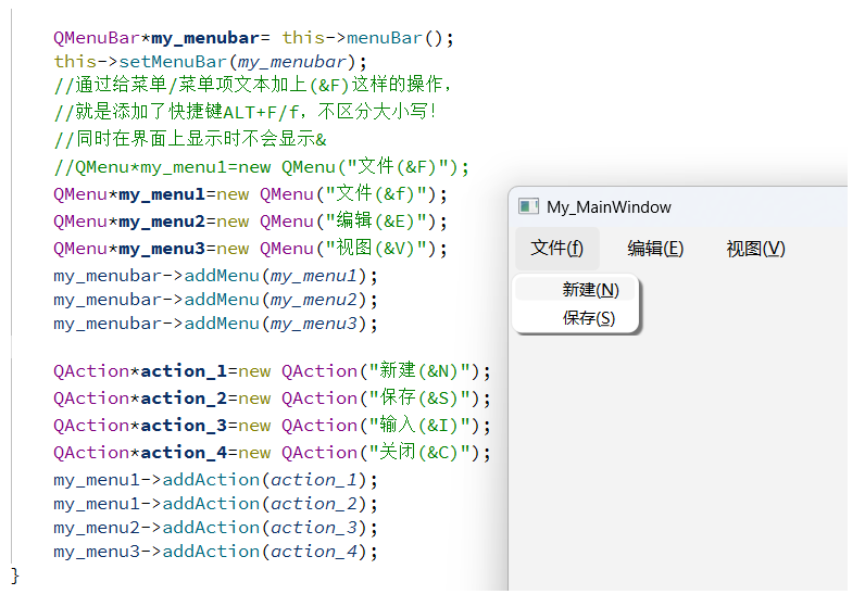 在 Qt 中,为菜单或菜单项设置快捷键可通过 QAction 类实现,主要有两种方式:一是构造 QAction 时指定,即创建菜单项对应的 QAction 时,直接在构造函数中通过 & 符号指定(& 后的字母会作为 Alt 组合键);二是通过 setShortcut () 函数设置,即对已创建的 QAction,使用该函数明确指定,且支持 Ctrl、Shift 等组合键。我们这里使用的是第一种方式,相较于第二种方式更方便简洁,第二种方式在前面给控件设置快捷键使用过,这里就不介绍了!