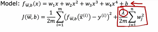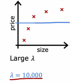 因为如果λ非常非常大,那么算法会非常倾向于保持这些参数w非常小,这样的话,w1、w2、w3、w4都几乎为0,所以该函数就近似于常数b,这就是为什么是图片上表现的常函数,这个模型很明显有很高的偏差,并且对数据欠拟合