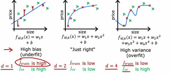 以上面欠拟合的情况为例,如果我们计算jtrain,算法在训练集上的表现如何呢,答案是表现并不好,所以我会说Jtrain在这里会很高,因为示例和实际之间存在相当大的错误,因此如果我们有一些新的例子Jcv,这些是算法以前没见过的样子,表现同样不好,所以Jcv也会很高,所以可以看出,高偏差的模型具有一个普遍的特征就是它在训练集上的表现不好