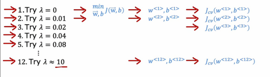假设我们尝试使用λ等于0来拟合模型,我们会通过该λ来最小化成本函数,并得到一些参数w1、b1,然后计算Jcv,随着我们尝试的λ越多,我们得到Jcv就越来越多,使用这些不同的正则化参数拟合参数,然后评估它们在交叉验证集上的表现,我们可以尝试选择出最好的正则化参数,然后我们纵览全部Jcv,我们发现w5、b5的Jcv最小,那么我们会选择这个λ值,最后,如果我们想要报告一个泛化误差的估计值,我们会报告测试集误差,我们可以计算w5、b5的Jtest