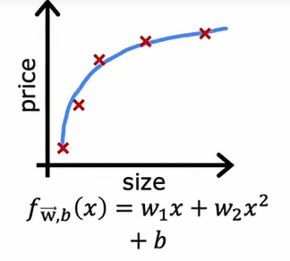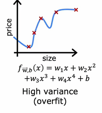 给定这个数据集,如果我们用一条直线拟合它,效果并不好,我们说这个算法有高偏差,或者它对这个数据集欠拟合,如果我们用四阶多项式拟合