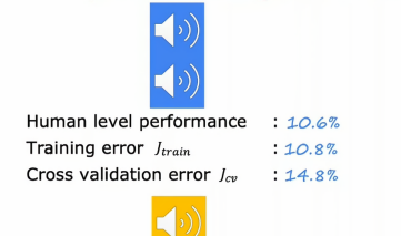 我们让用户有时候可以用语音输入,这样我们得到训练失误的概率是10.8%,这说明机器有10.8%概率判断失败,并且我们还要测量语音识别算法在单独的交叉验证集上的表现,假设它的错误率是14.8%,乍一看感觉机器的出错的概率好像还很高,但是实际上人类出错的概率为10.6%,我们发现人和机器的差别好像很小,在现实生活中,如果训练误差和人类现有水平差别不大的话,就说明机器在方面表现还是出色的,但是这里我们发现一个问题,就是Jcv和Jtrain的差距很大,按照我们上一节的知识来判断,这应该属于的时方差问题而不是偏差问题