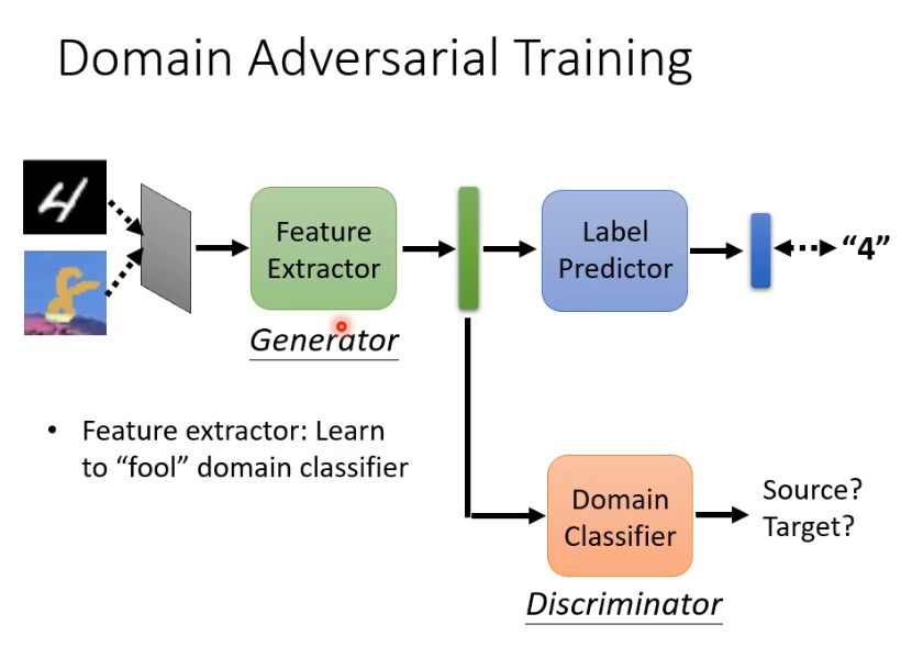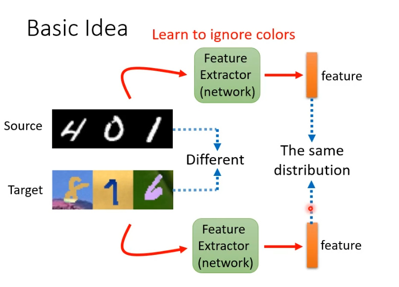 解决这个问题的基本想法是找一个feature extractor(本身是network),它以图片作为输入,输出一个向量。虽然source domain和target domain的图片表面不一样,但是期望feature extractor可以把他们不一样的部分去掉,抽取出共同部分,无视掉颜色的差异。这样就可以用这些feature训练一个模型直接用在target domain上。