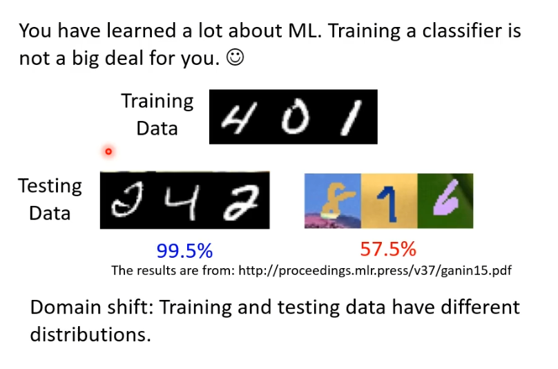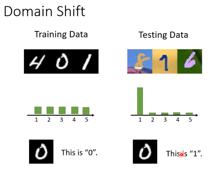 假设训练资料与测试资料分布不同会怎么样呢?举一个例子,假设数字辨识模型训练时是黑白的数字,但测试时是彩色的会发生什么事情?在黑白测试资料上会有很高的正确率,但是在彩色测试资料上就达不到及格分数。所以一旦训练资料与测试资料存在差异,训练出来的模型很可能会"坏掉"。这种问题叫作domain shift。