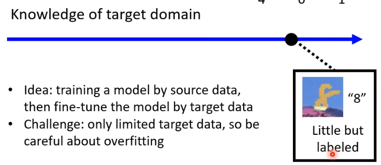 想要做到把模型用在不一样的domain上,在训练时就需要对target domain有一定的了解。一种情况是在target domain上有少量标注的资料,这种情况就可以用target domain来微调在source domain上训练出来的模型(类似BERT),但是要注意overfitting的情况。