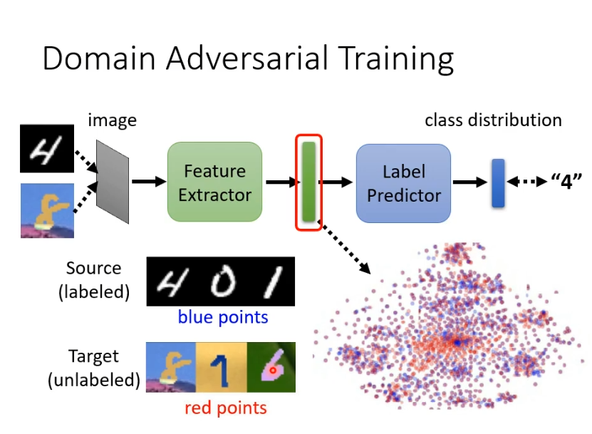 如何找出这样的feature extractor?可以把一个一般的classify分为feature extractor和label predictor两个部分。我们将source domain和target domain的图片丢进去把feature extractor的输出拿出来看。要让他们的输出看不出差异,即红色和蓝色的点分不出差异。