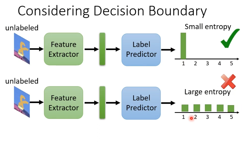 举例来说,一个简单的做法是一张未标注的图片虽然我不知道它属于哪个类别,但是希望它离分界线越远越好。如果输出的结果特别集中,就离分界线远,输出结果每个类别都非常接近,就离分界线近。