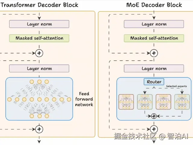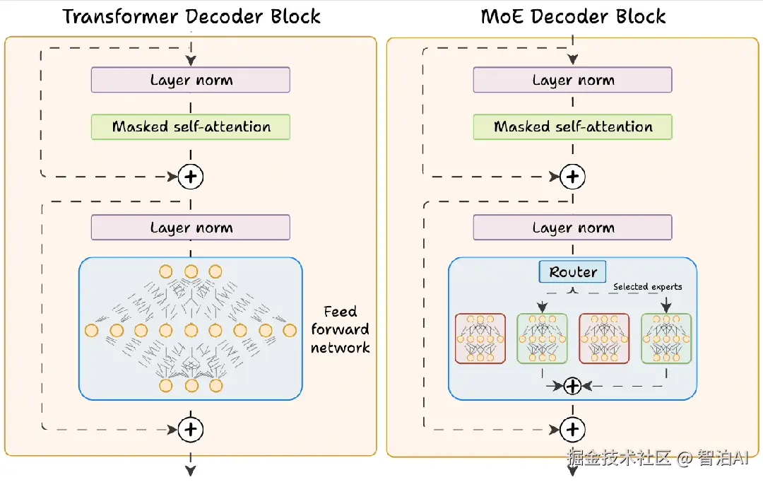 Transformer 和 MoE 在 decoder 块中有所不同: