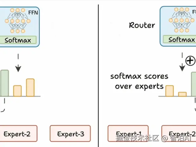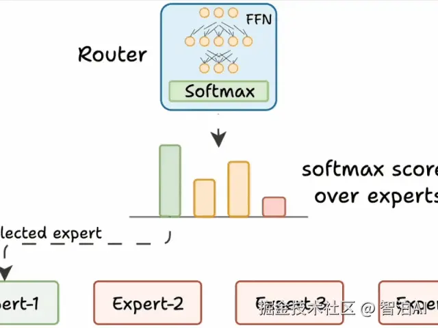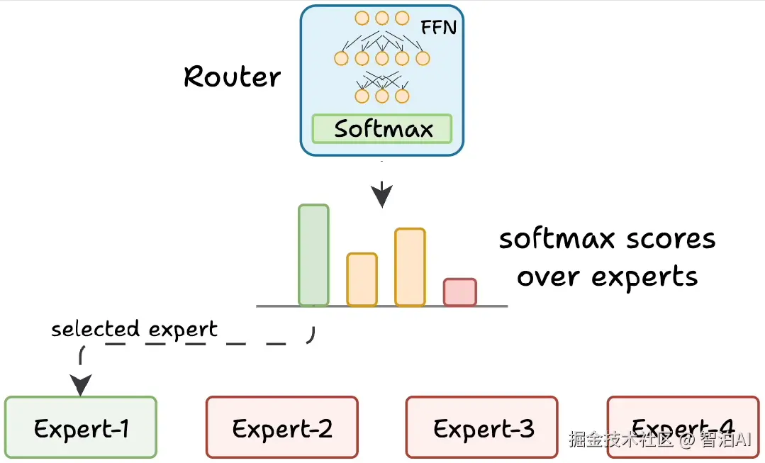 路由器就像一个多分类分类器,它对专家生成 softmax 分数。根据这些分数,我们选择前 K 个专家。