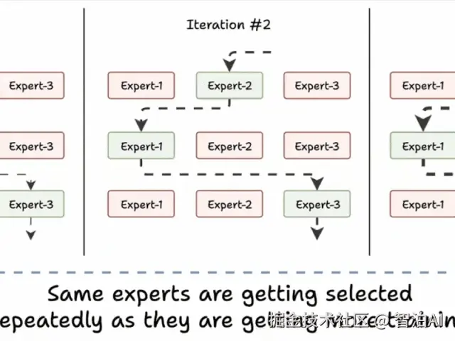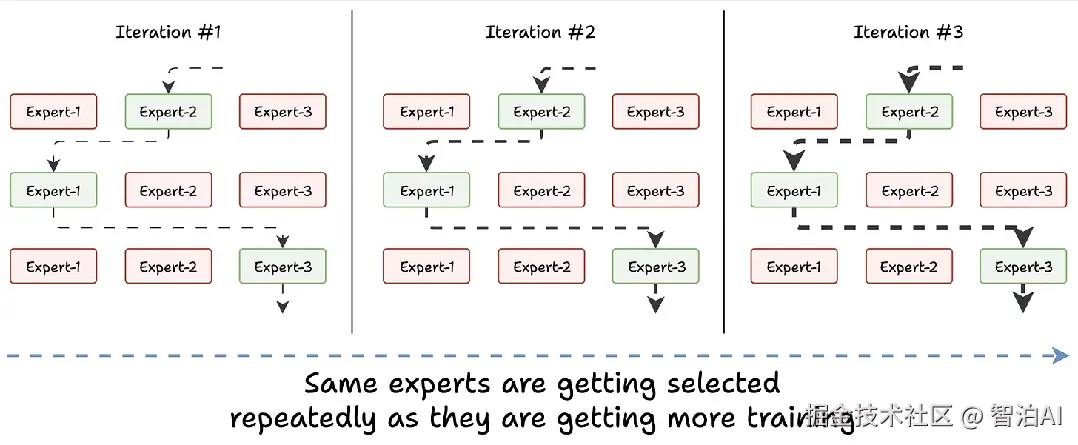 在训练初期,所有专家的能力相似,路由器可能会随机选择某个专家(例如"专家2")。随着训练进行,这个专家会因频繁使用而变得更强,随后被更频繁地选中,形成恶性循环: