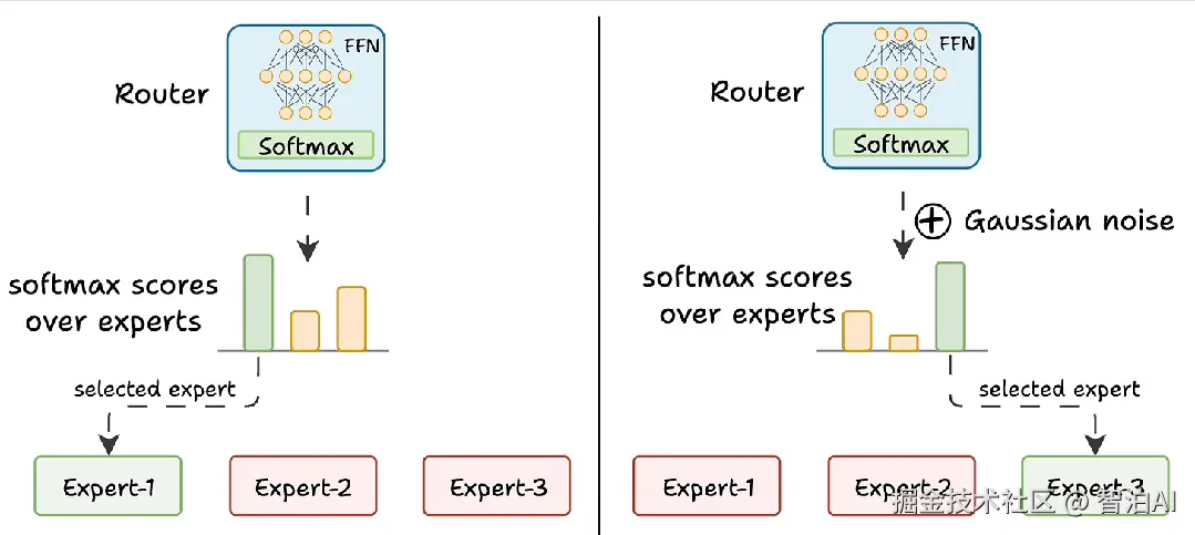 - 添加噪声:在路由器的输出logits中加入随机噪声,使其他专家有机会获得更高的分数,从而被选中。