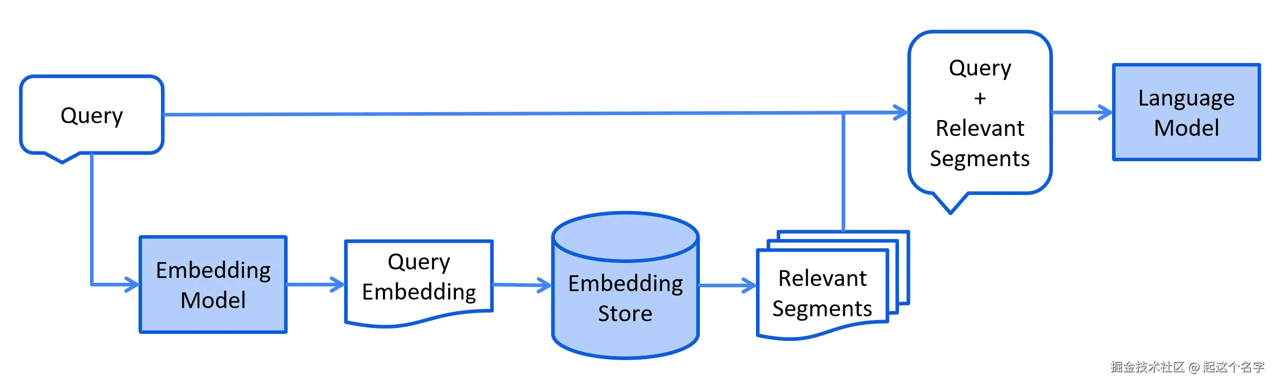 这个过程可能因使用的信息检索方法而异。 对于向量搜索,这通常涉及嵌入用户的查询(问题) 并在嵌入存储中执行相似度搜索。 然后将相关片段(原始文档的片段)注入到提示中并发送给 LLM。
