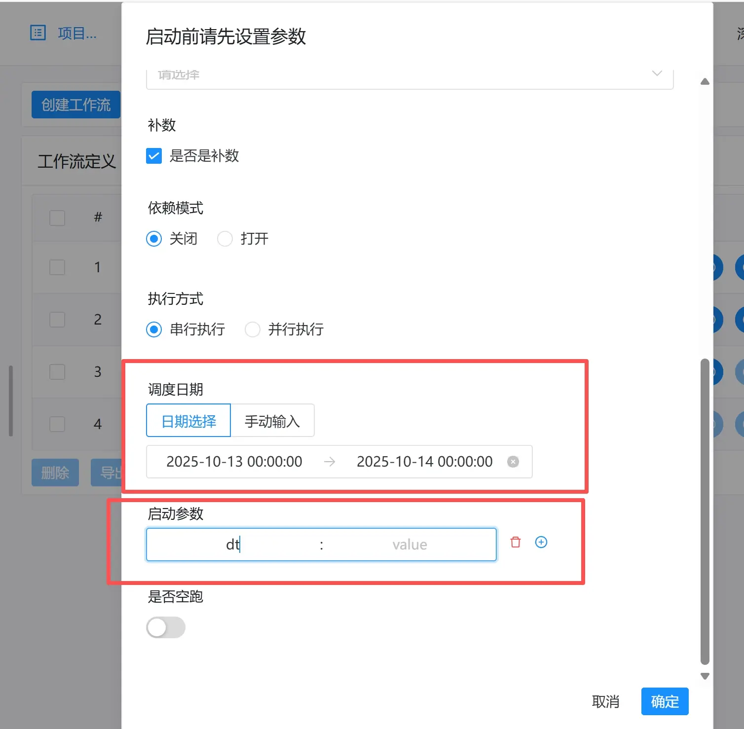 在工作流启动界面中,补数据功能包含以下配置选项: