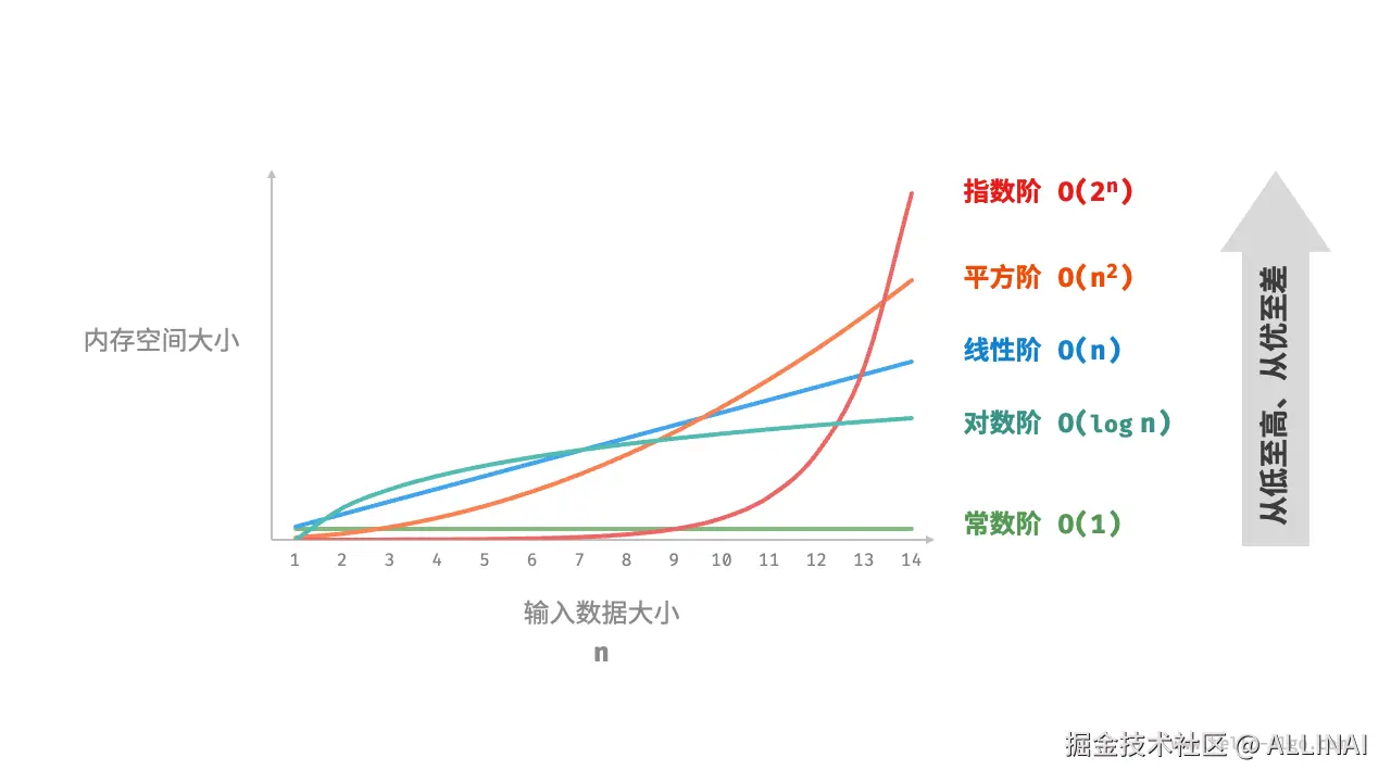 空间复杂度衡量算法运行时占用的内存量,通常也依赖于输入规模。
