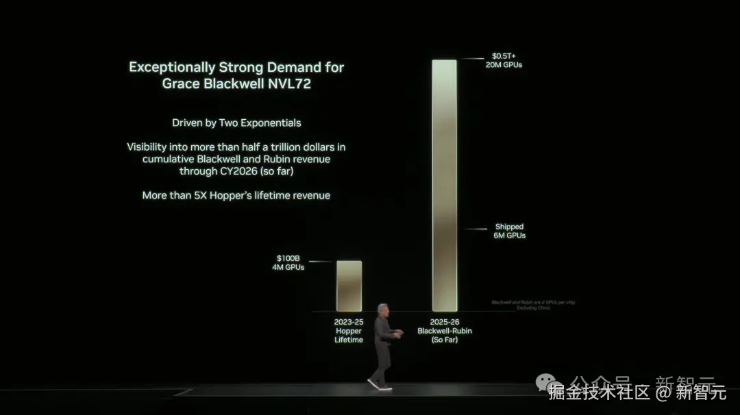 老黄预测,在 2026 年底前,仅凭「Blackwell+Rubin」就足以冲击 5000 亿美元的营收。