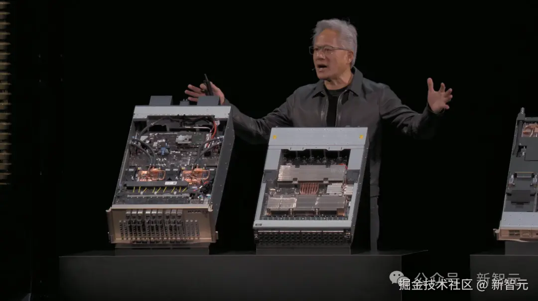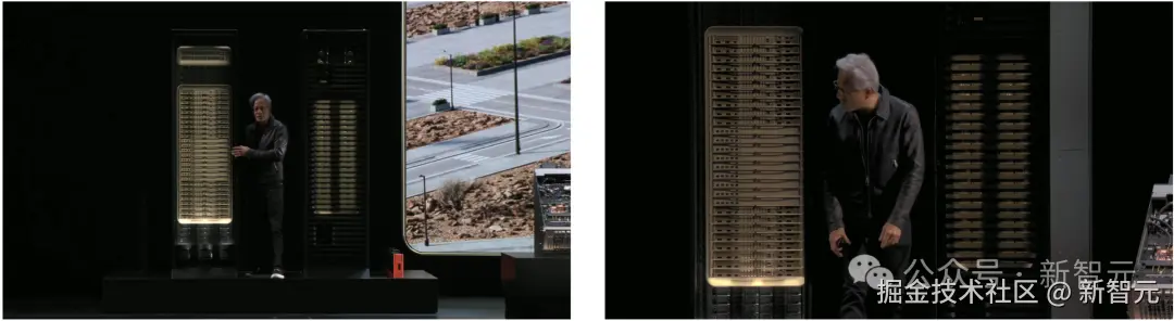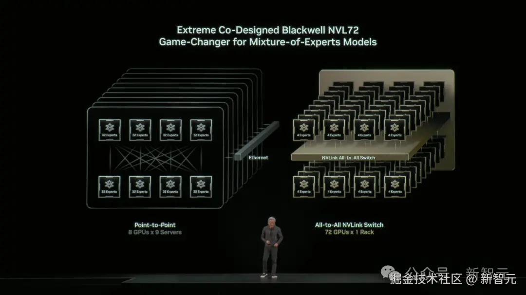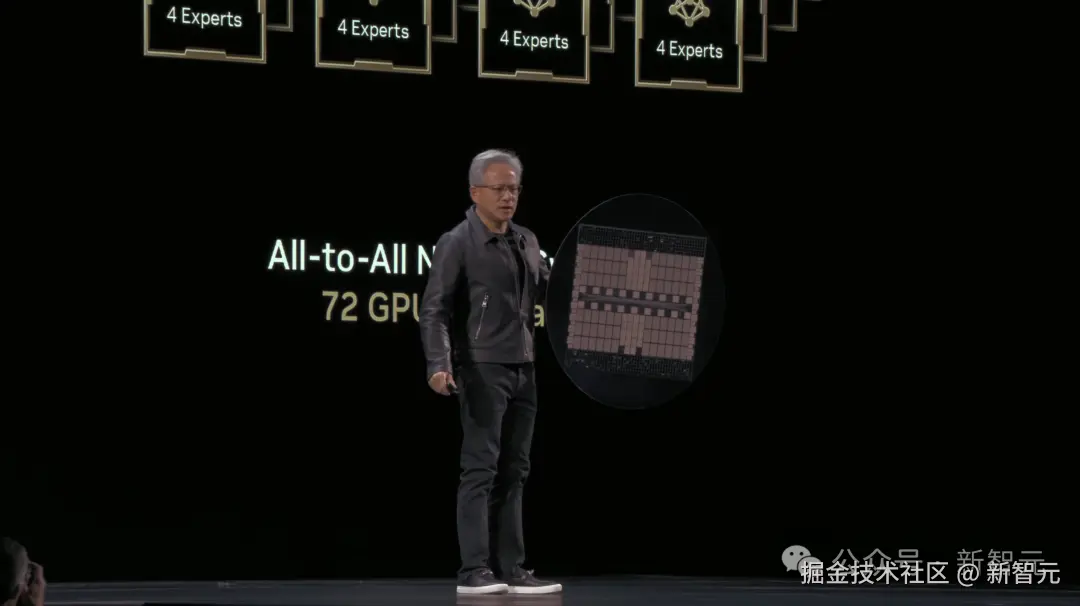 为了更直观说明,老黄再次上演「芯片版美队」,手里拿着巨型芯片,由 72 块 GPU 无缝互联。