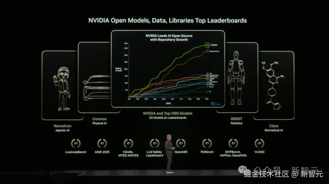 为此,英伟达也在全力投入这一方向。目前,他们在全球开源贡献榜上,23 个模型上榜,覆盖了语言、物理 AI、语音、推理等全领域。