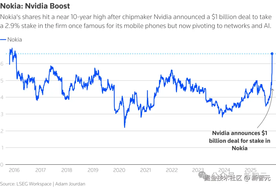 与此同时,英伟达还将以每股 6.01 美元的认购价向诺基亚投资 10 亿美元。