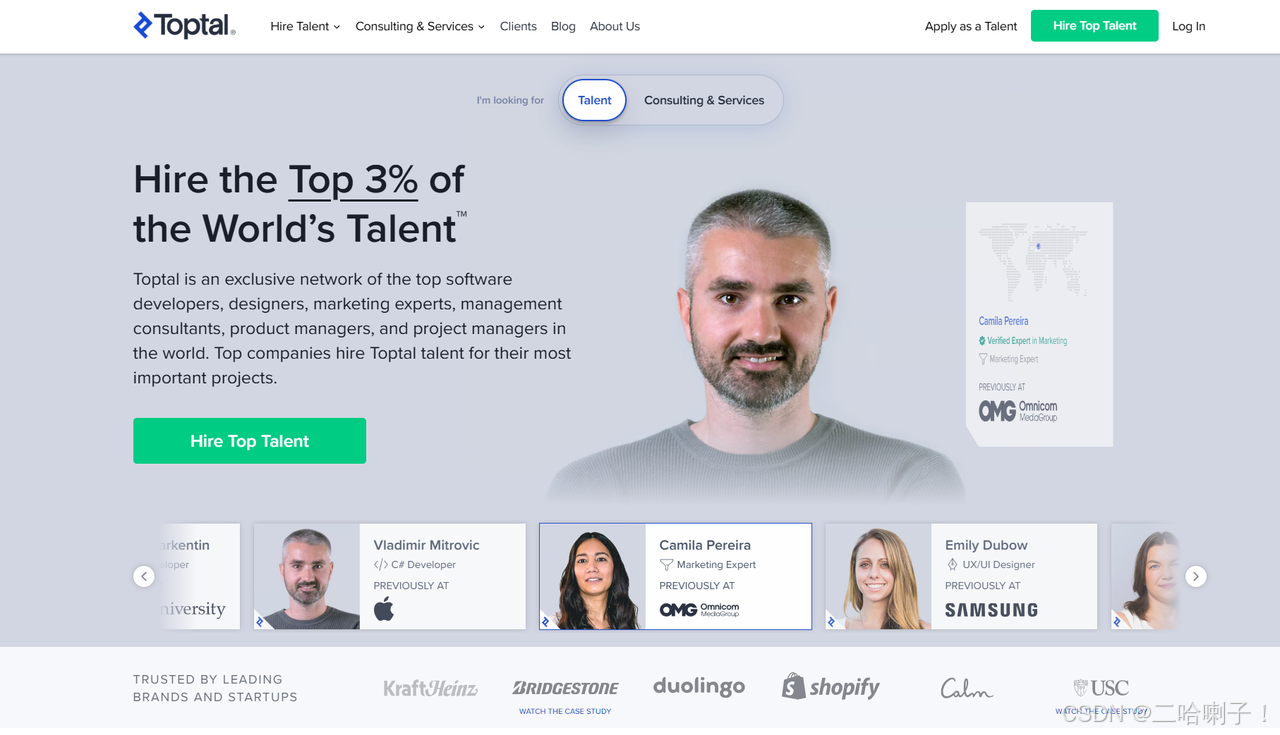 Toptal 是一个高端的国际软件外包平台。它主打只接受前 3% 的自由职业者,所以审核非常严格,包括技术测试、面试等。