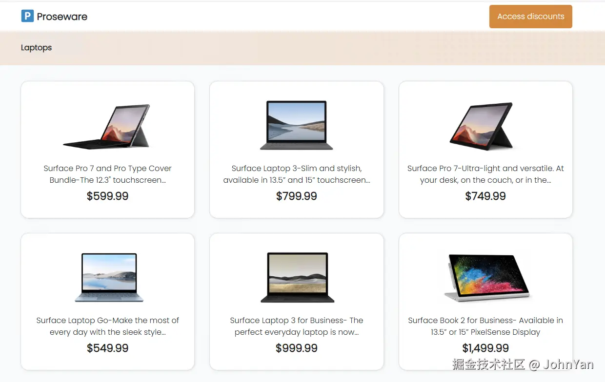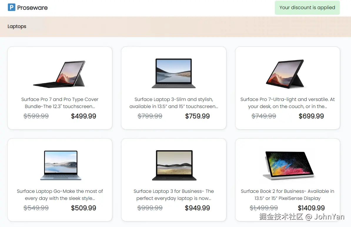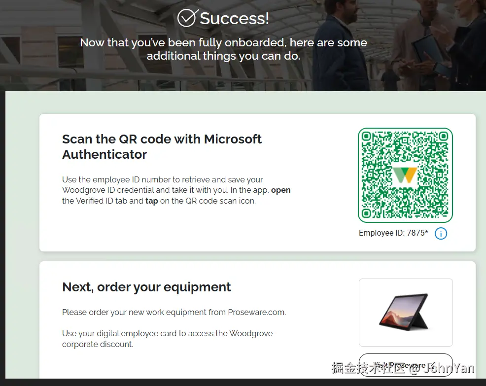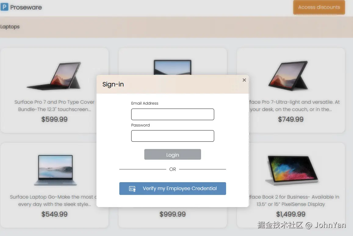职员的验证ID还可以在外部使用。如在个人主页上,点击"Visit Proseware",会跳转到一个外部的第三方商城页面。公司已经和这个电商达成了协议,如果职员在这个商城购物,可以享受员工折扣: