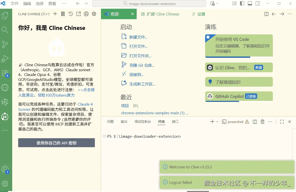 cline是vscode的一个插件,首先我们要下载vscode编辑器,然后在插件商店搜索cline并安装,安装好了之后侧边栏就会出现一个cline图标,点一下就进入使用cline的地方。