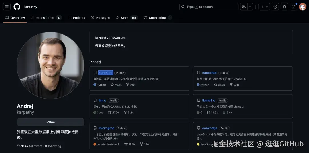 说开源项目之前,先聊聊项目作者 @karpathy。他是 AI 领域的顶尖研究者和技术领袖,全球最牛逼的 AI 科学家之一。