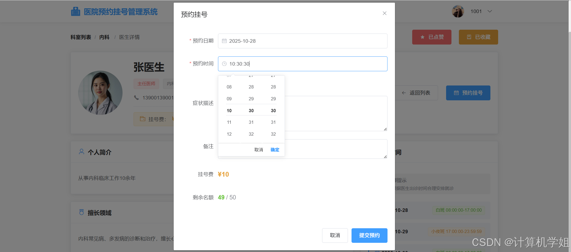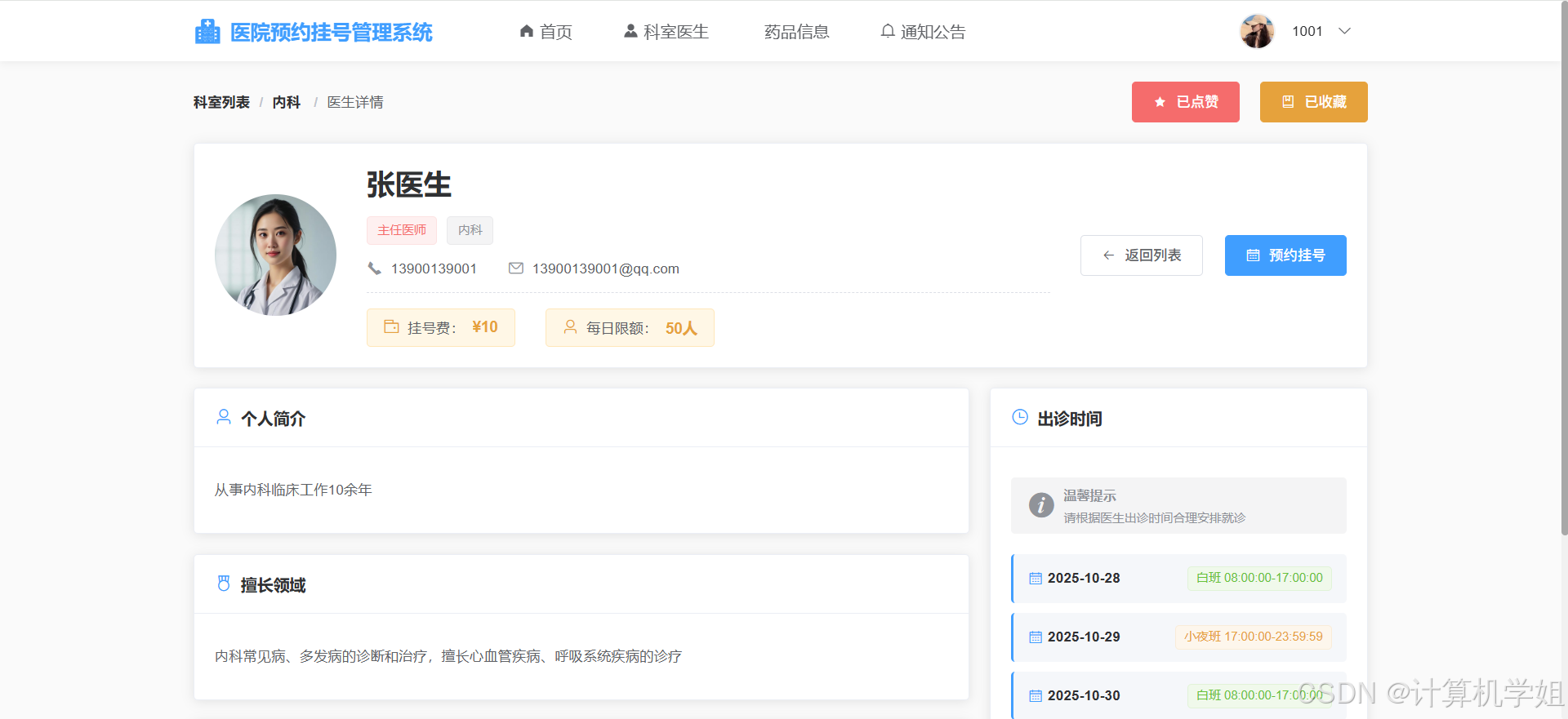 医生详情界面:支持点赞收藏、预约挂号、只能选择有排班的日期时间
