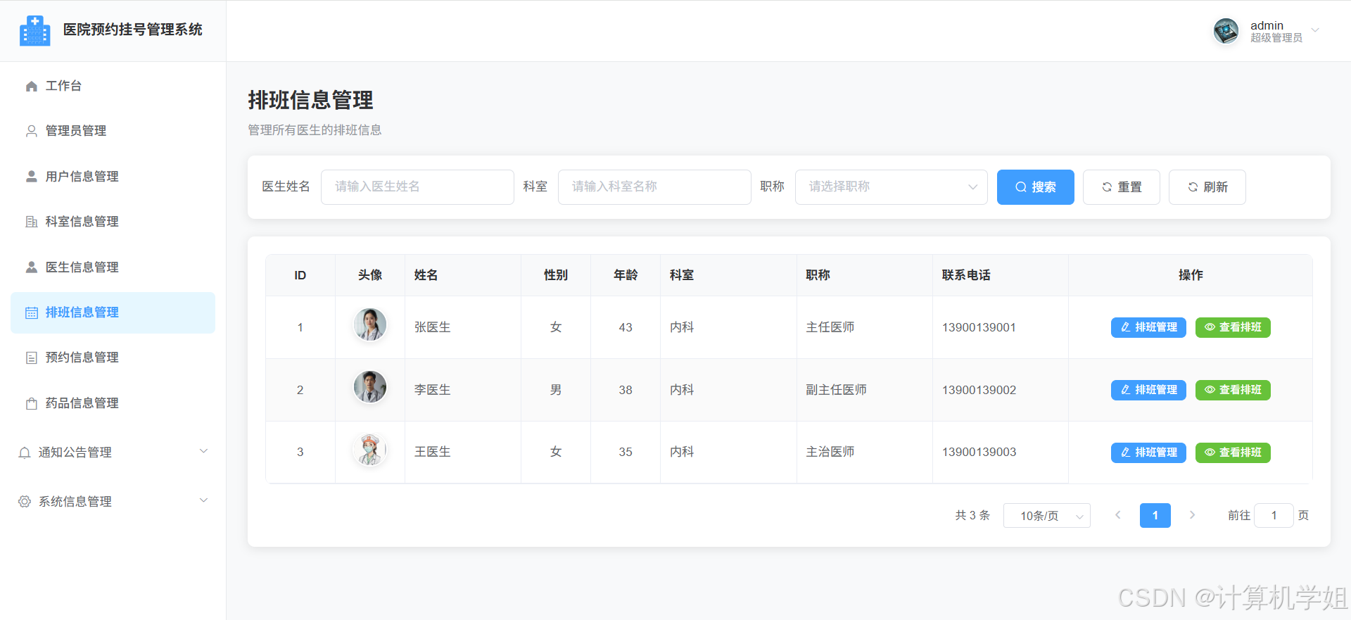管理员界面,排班信息管理