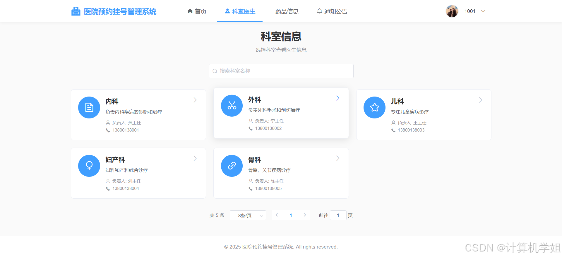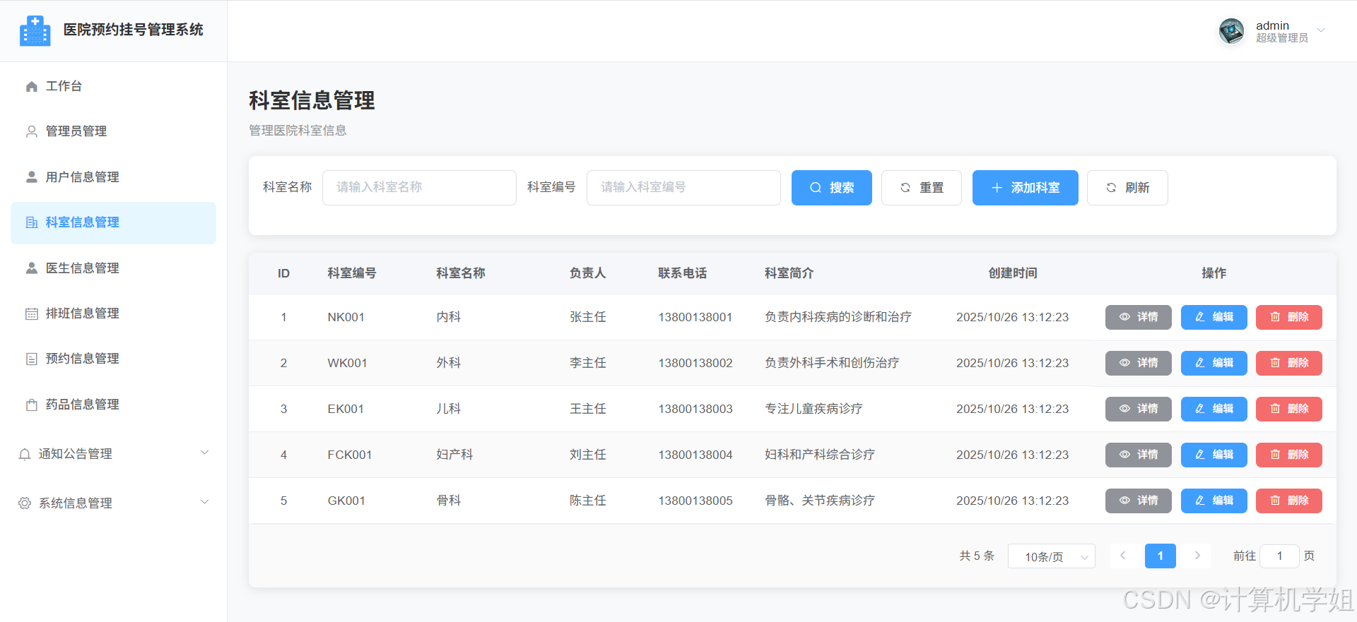 管理员界面,科室信息管理