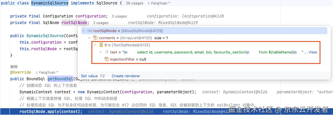 先前我们提到过,包含 $ 占位符的 SQL 也会被识别为动态 SQL(SqlSource 类型为 DynamicSqlSource),同样我们需要看一下它获取 BoundSql 的逻辑 org.apache.ibatis.scripting.xmltags.DynamicSqlSource#getBoundSql。在执行该方法时,可以发现整条 SQL 语句被解析为字符串保存在 TextSqlNode 中: