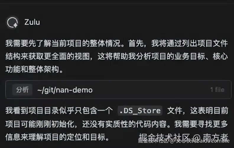 一会后,描述完,它开始干活了!首先它先分析你目录有没有描述(联系寻找内容的上下文关联)的情况。