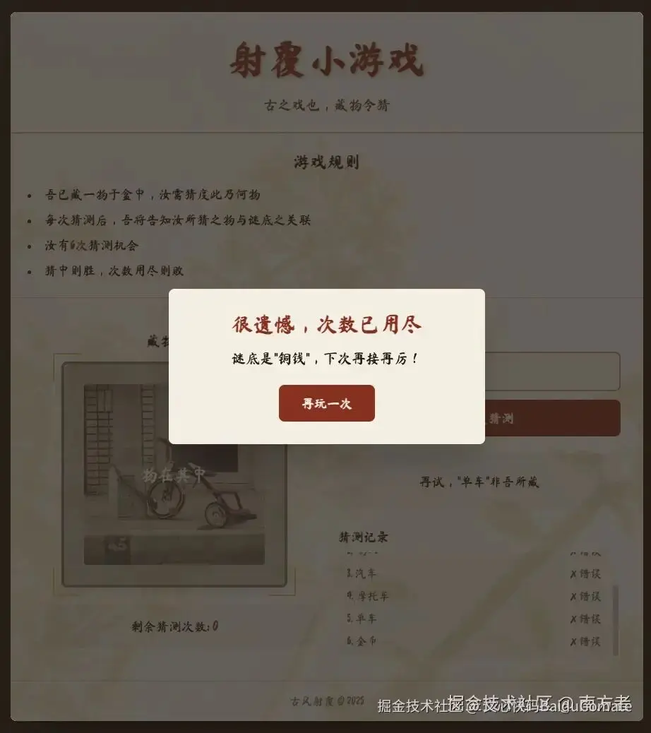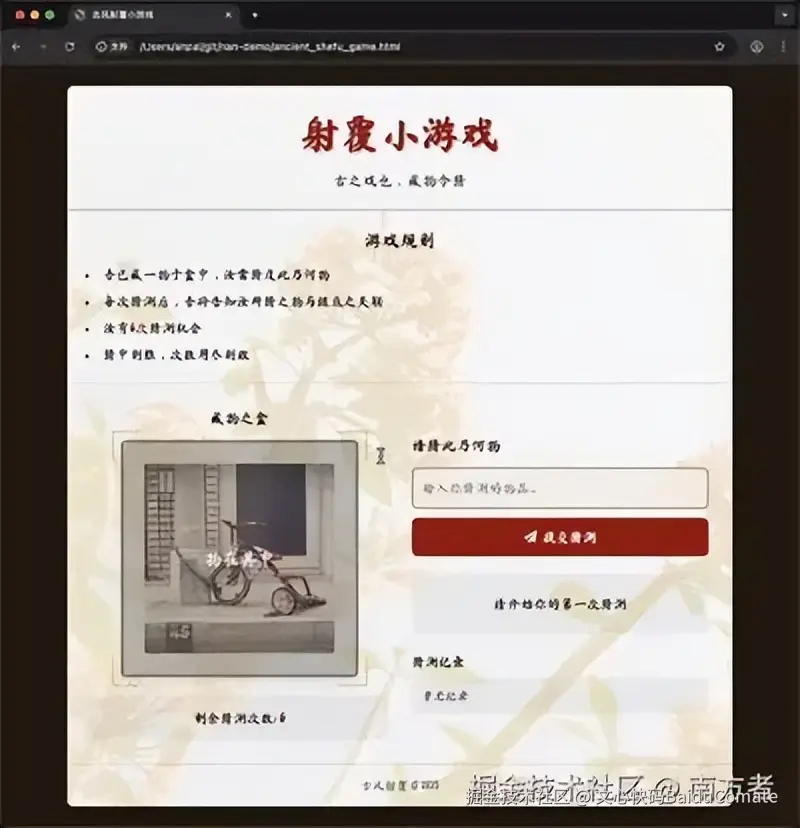 "文心快马加鞭!" 在这个快速发展的时代,效率就是竞争力~文心快码让每一位开发者都能快马加鞭,在技术创新的道路上领先一步。无论开发像射覆小游戏这样的趣味应用,还是构建复杂的企业级系统,文心快码3.5S都是很好的选择。让我们一起拥抱AI编程的新时代,用智能赋能开发,用创新改变世界。