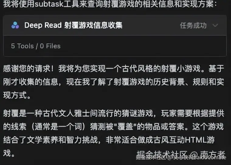 这时候,它发现,目录空的,文件没有的。它就明白了,这是要从0开始。它一顿翻阅资料,先了解什么是射覆,射覆的玩法,射覆的规则。