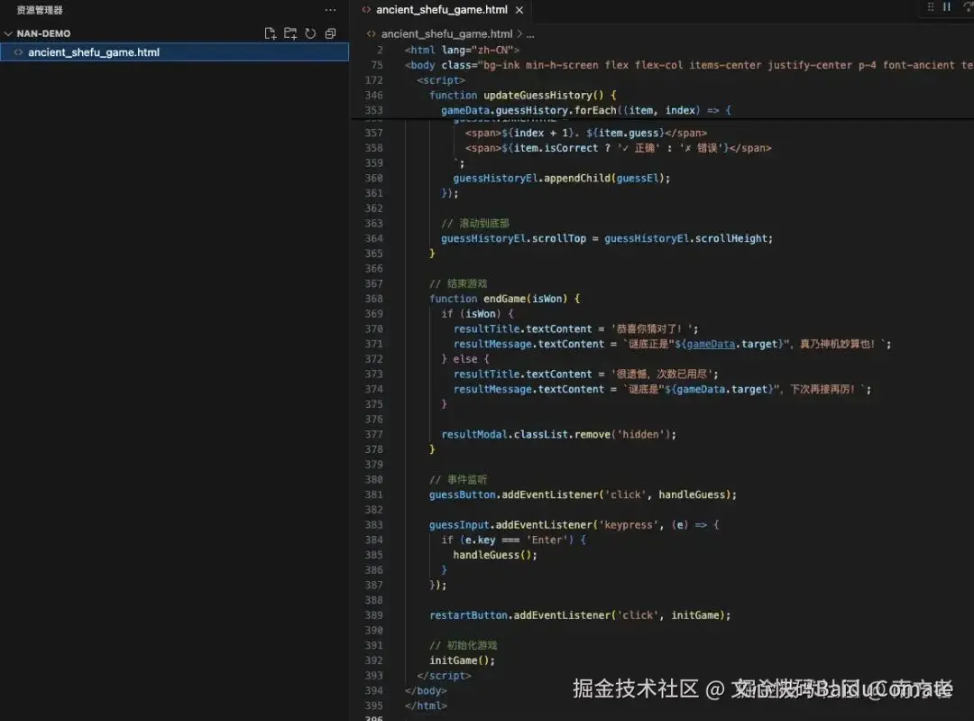 最后生成的 html ,就有了!汇聚在一个 html 中;而且这代码仅仅 395 行!