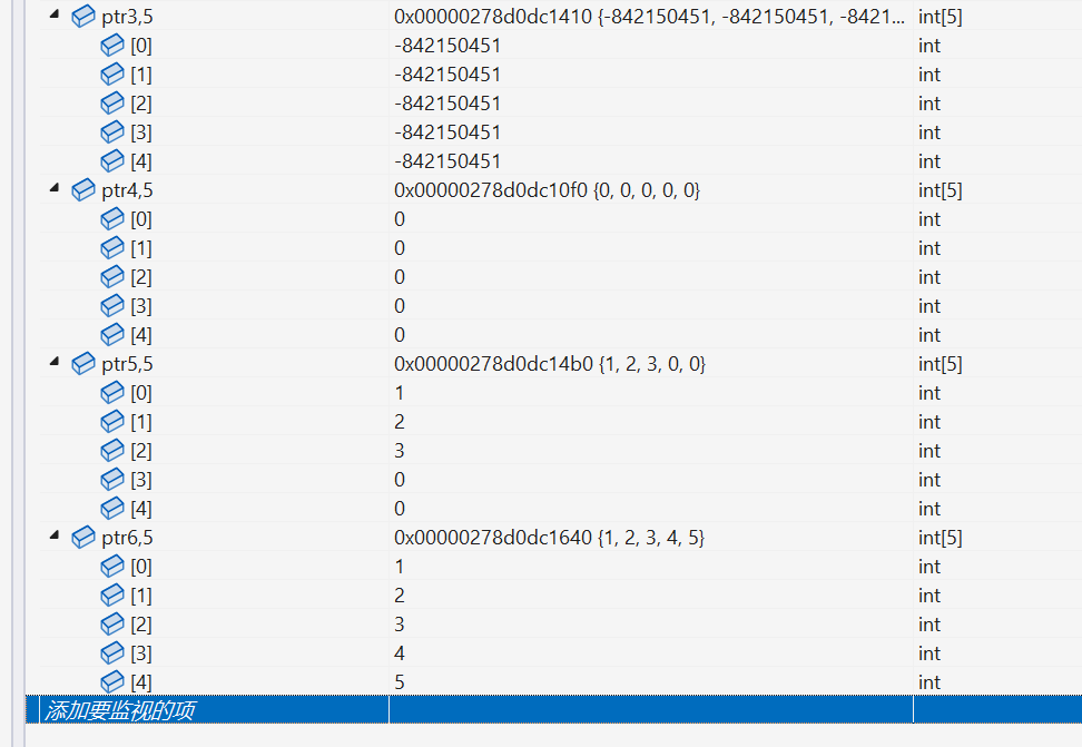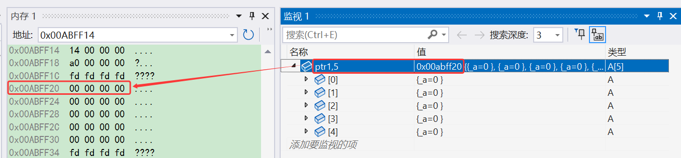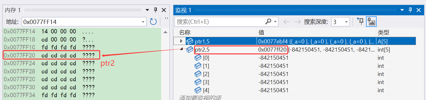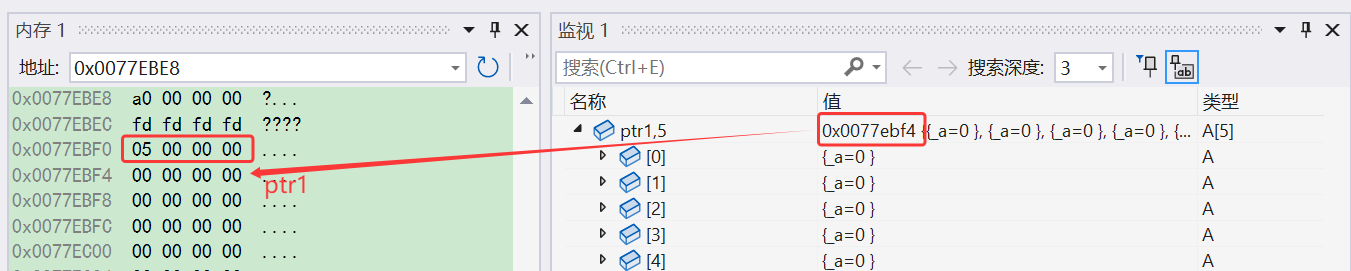 可以看到,在 ptr1 前面的 4 个字节中确实是5,我们也可以看看 ptr2 前面的 4 个字节中有什么