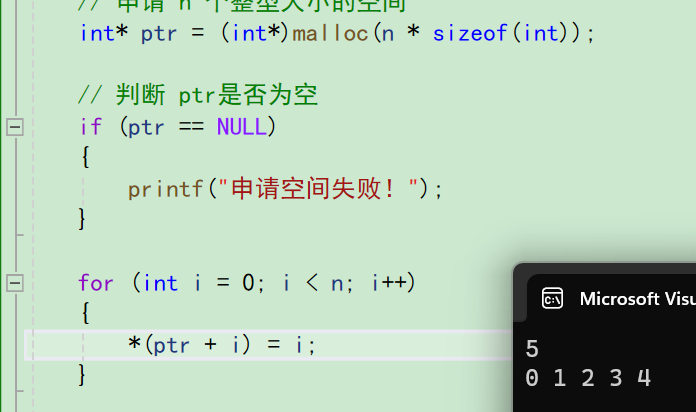 举例:申请 n 个整型大小的空间,然后对每个空间赋值,最后打印、释放内存。