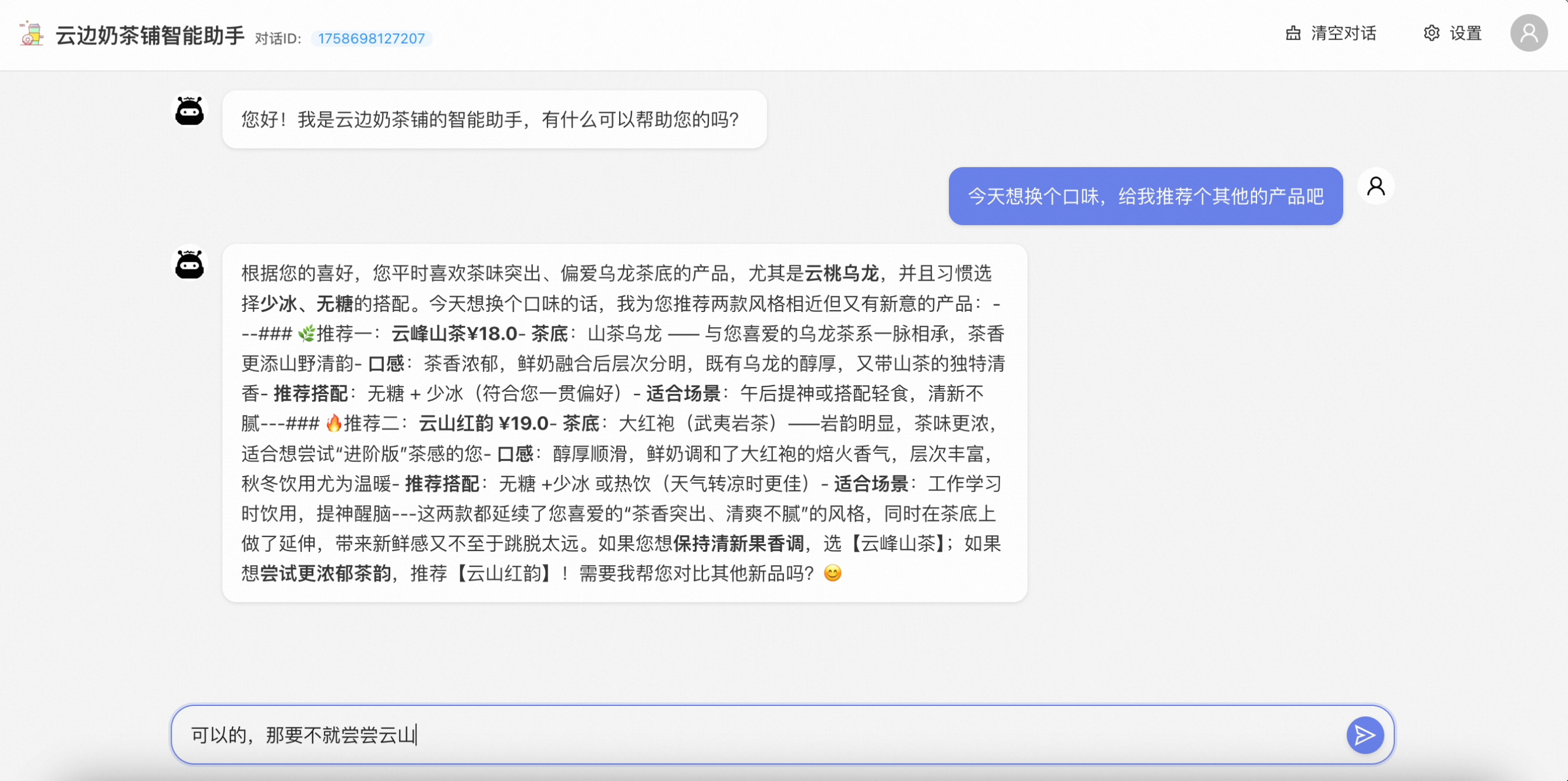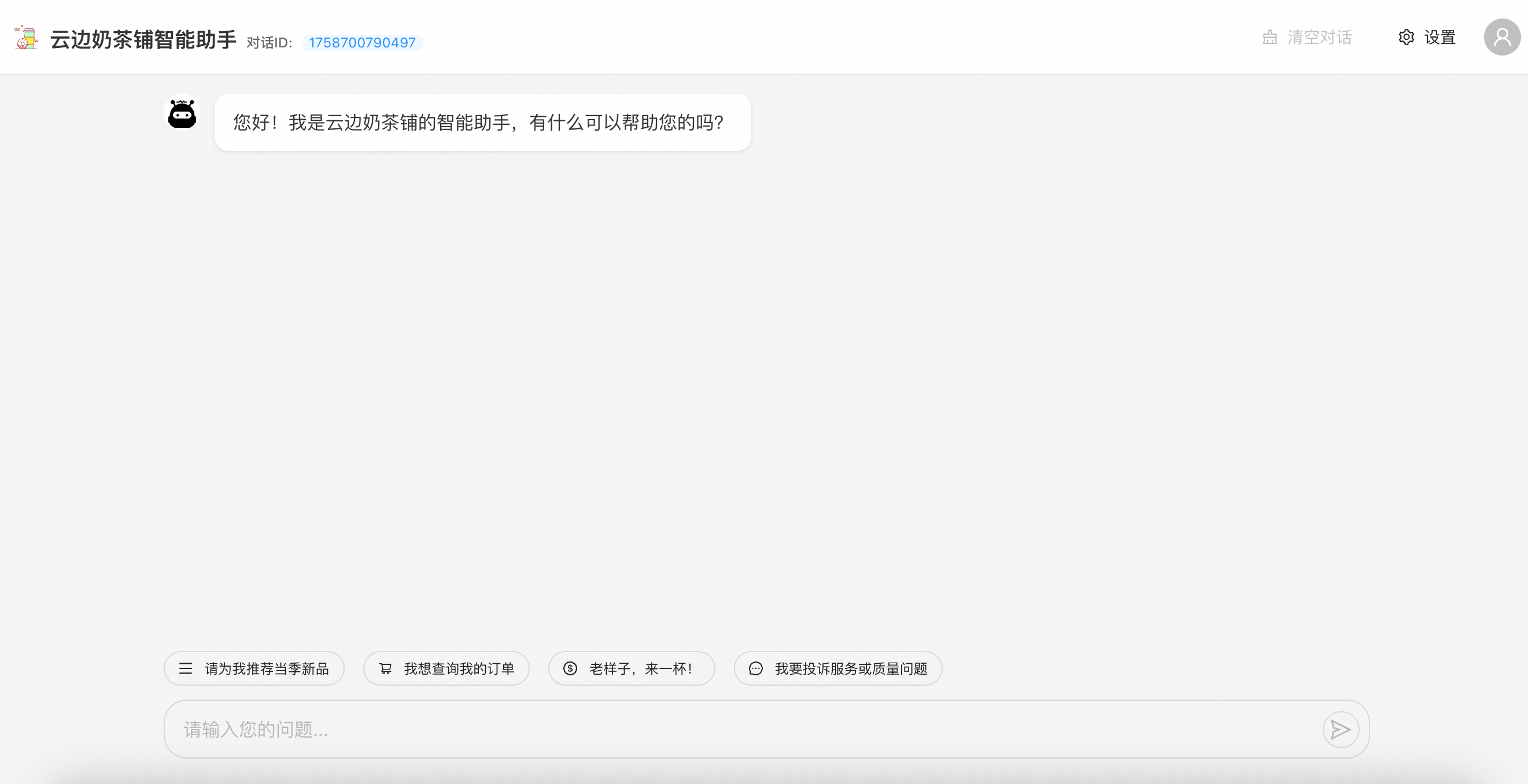 将上文所述 Demo 的全部组件完整运行起来之后,即可在浏览器中打开页面并和云边奶茶铺智能助手进行对话。