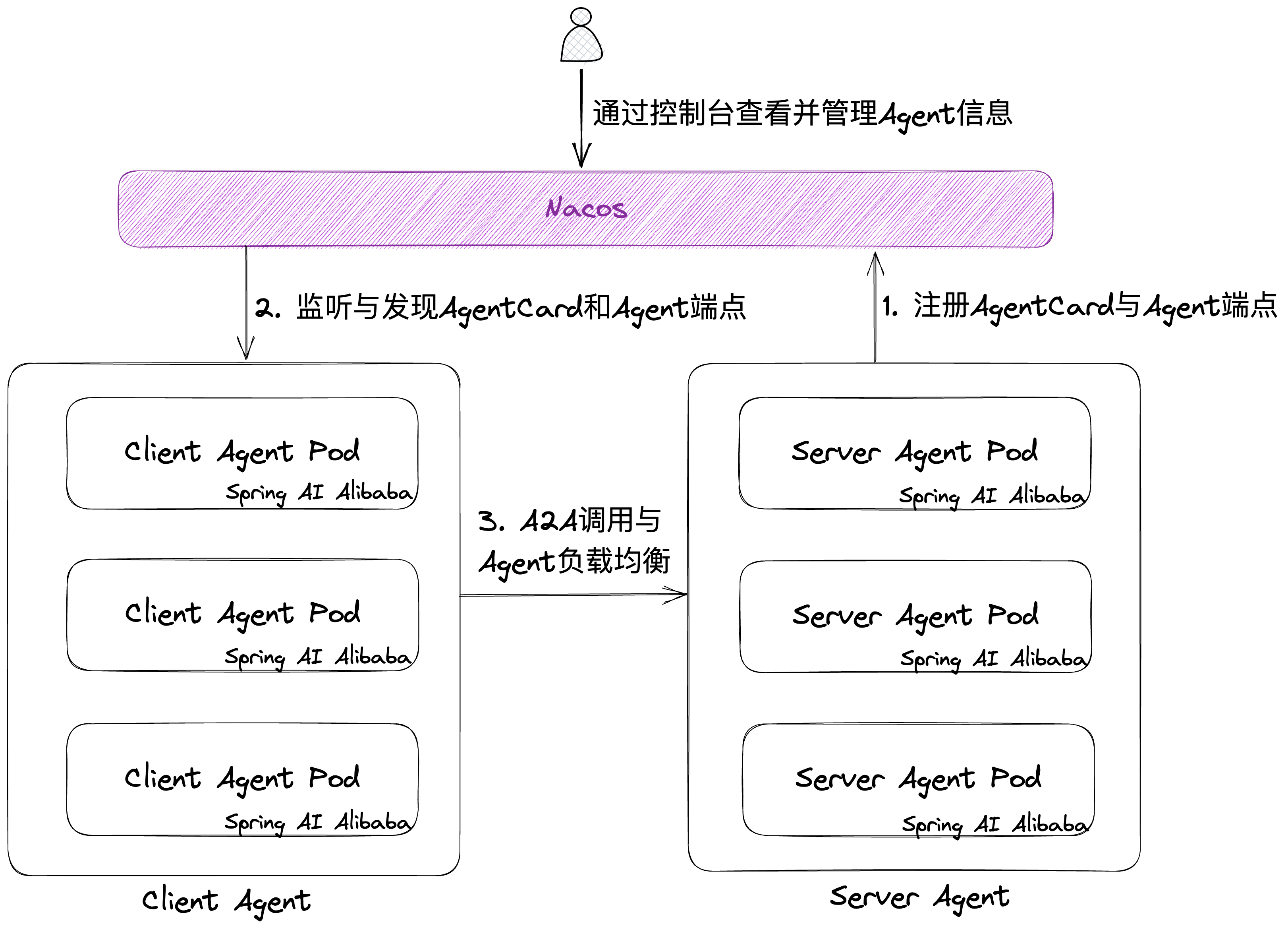 其中,Nacos 3.1.0 引入 A2A 了注册中心功能,提供了轻量化的 Agent 服务注册与发现能力;Spring AI Alibaba 通过集成 Nacos,提供了开箱即用的 Agent 注册、Agent 发现与负载均衡能力,让开发者能够快速构建使用 A2A 标准协议通信的分布式多智能体系统。