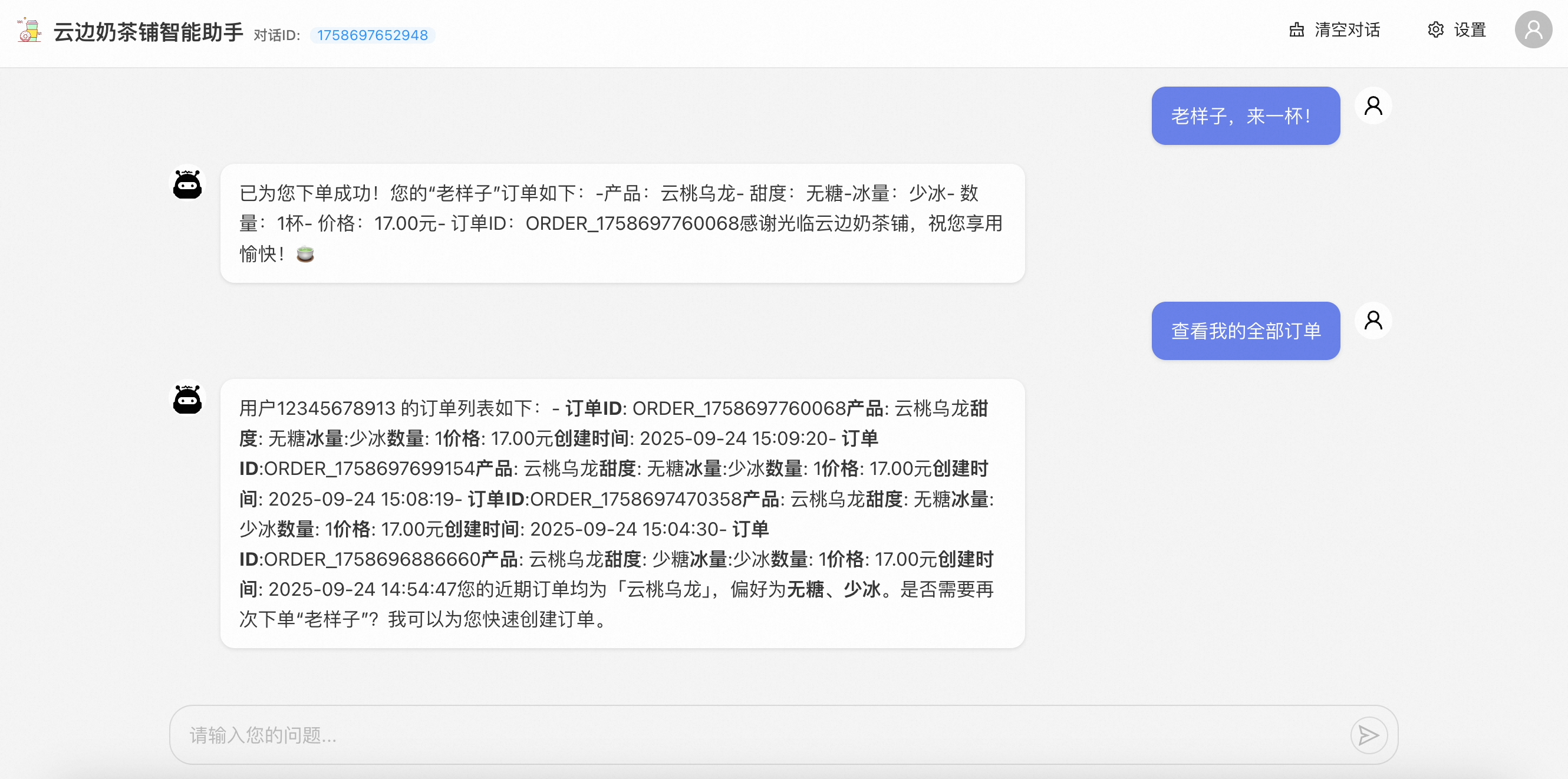 为了方便开发者参考和使用,我们基于 Spring AI Alibaba + Nacos 构建并开源了"云边奶茶铺智能助手" 分布式多智能体 Demo,让消费者一站式咨询、点单与反馈,持续根据用户行为和喜好推荐并下单产品, 从而实现"越来越懂我","越用越好用"的用户体验。