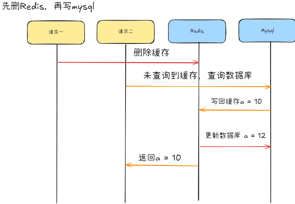 如果请求一在将数据写回redis的时候被某些原因阻塞了一会,导致写入redis时候的数据慢于请求二,那么次数redis中的a为 10 ,但是按照理论上来说是应该是要是为 12 的,所以此时即为脏数据。