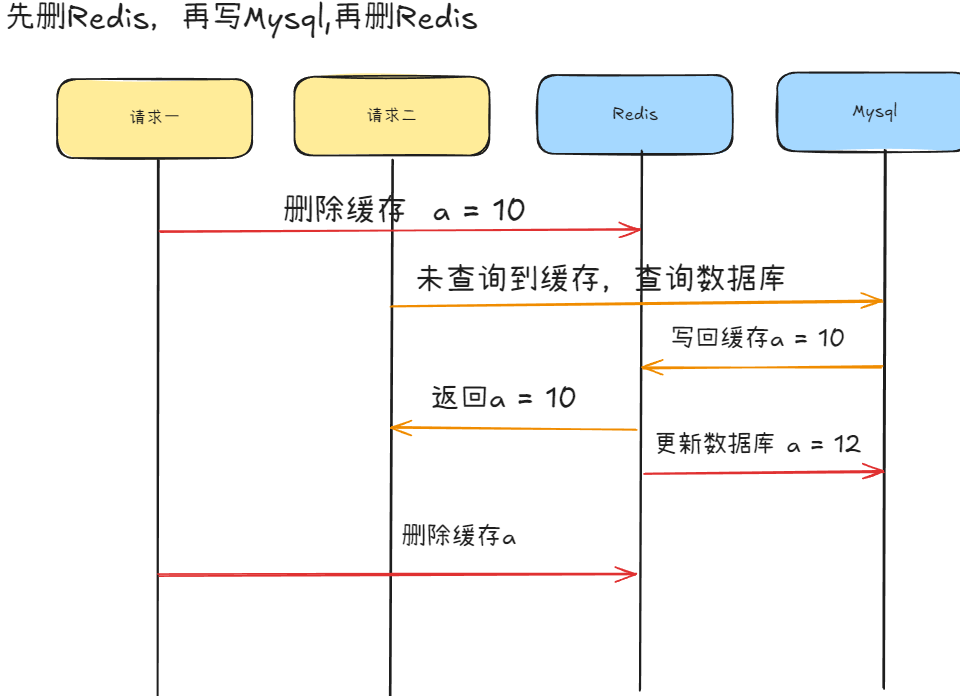 写请求 数据库 缓存 读请求 1. 更新数据A=新值 2. 删除缓存A 3. 读A(缓存缺失) 4. 读A(返回新值) 5. 回填A(新值) 6. 延迟删除A(误删正确的新值!) 7. 读A(缓存缺失,重新回填)→ 额外性能损耗 写请求 数据库 缓存 读请求