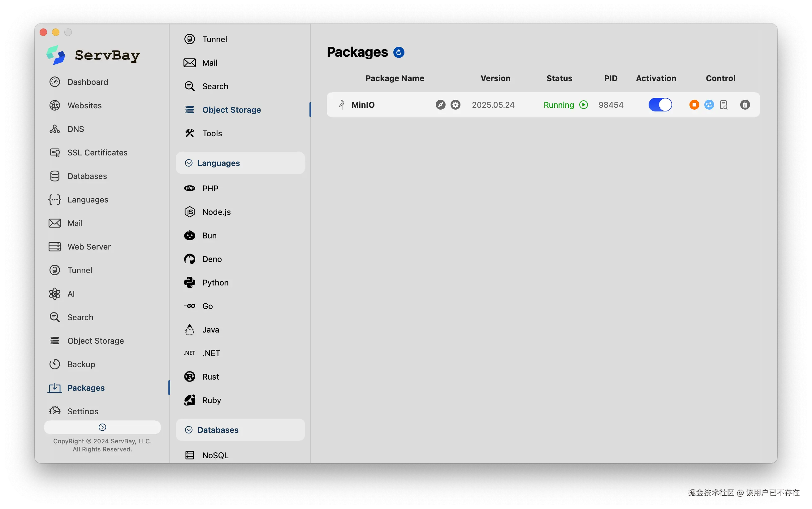 这时候就可以考虑开发神器 ServBay 了,它除了支持各种常用开发语言 ------ Python、Java、Golang,还有常用SQL和NoSQL数据库,它还支持 MinIO 这种常用的服务。用户就不需要跟 Docker 命令死磕,也不用管什么复杂的依赖配置,在 ServBay 面板上点几下,一个热乎乎的 MinIO 服务就跑起来了,省下来的时间摸摸鱼、喝喝茶,爽歪歪。