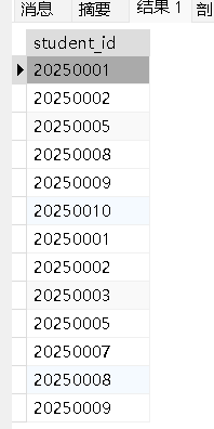 MySQL UNION 操作符用于连接两个以上的 SELECT 语句的结果组合到一个结果集合,并去除重复的行。(eg:即如果某个 student_id 同时满足两个查询条件,最终结果中只保留一次)