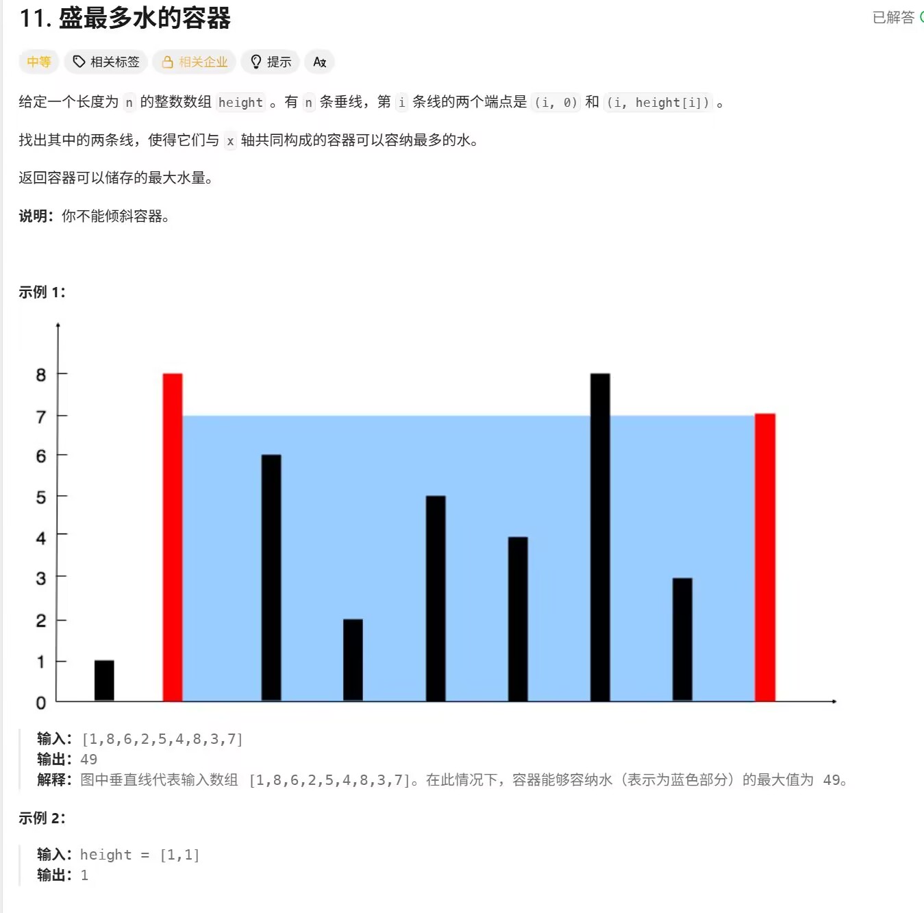 这道题让我们求承最多水的容器,也就是求面积最大的区域,所以这道题我们应该找出面积最大的区域。我们可以先定义出一个left和一个right用来表示height数组中的最左侧位置和最右侧位置,然后我们通过min来比较谁的高度比较小并且与距离相乘用来求出当前区域的面积。然后与最大的面积相比留下最大的面积,随后我们比较right和left所对应的数组元素的高度,较小的一方缩进数组,随后再重复以上方法,进而比较出面积最大的区域。