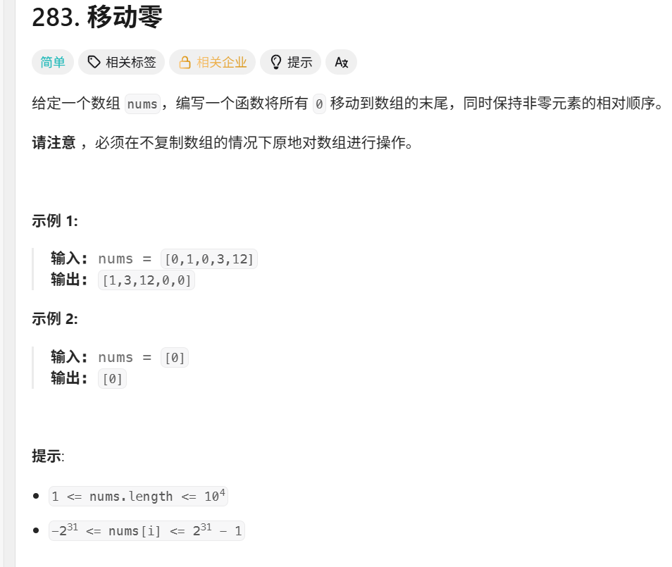 这个代码中我们会用到两个指针,一个fast指针一个slow指针,快指针用来遍历整个数组,而慢指针用来指向非0的位置,遇到非0元素+1即可