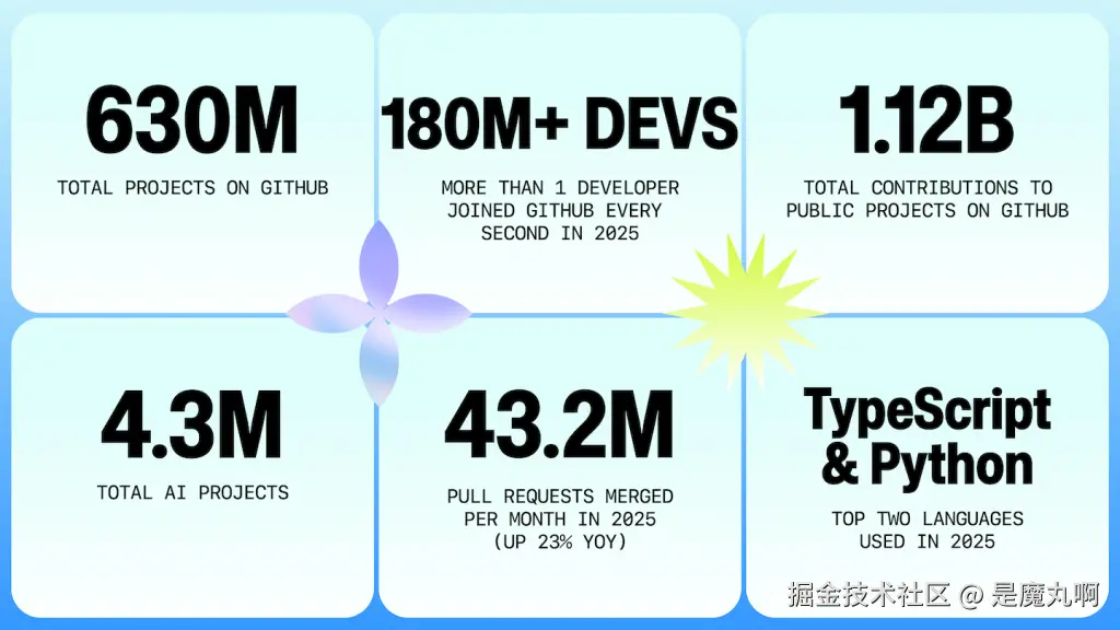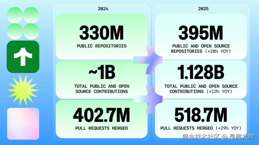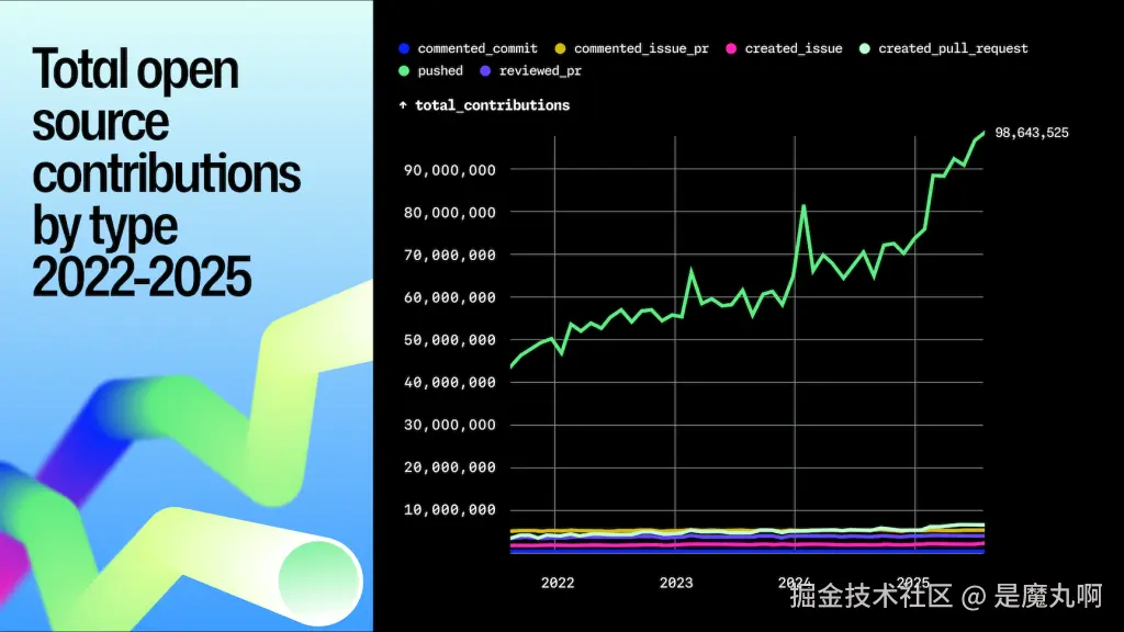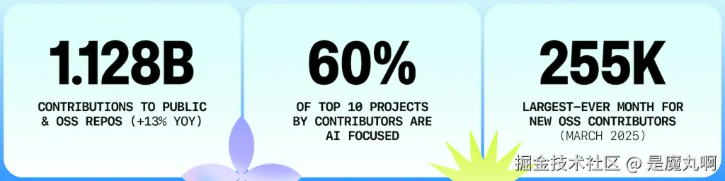 今年开源发展达到创纪录水平,公共仓库贡献11.2 亿(同比增长 13%)。2025 年 3 月标志着 GitHub 历史上新开源贡献者最多的单月:25.5 万首次参与者。