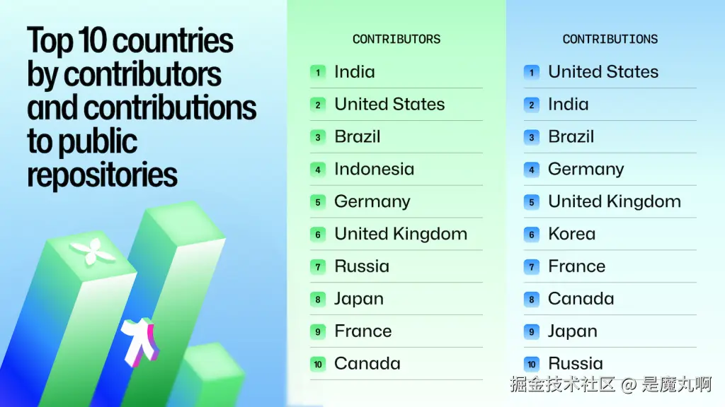 印度超越美国成为 GitHub 上公共和开源项目的最大贡献者基础。它也有望在未来几年内超过美国开发者人口,突显了开发者社区已经变得多么全球化。