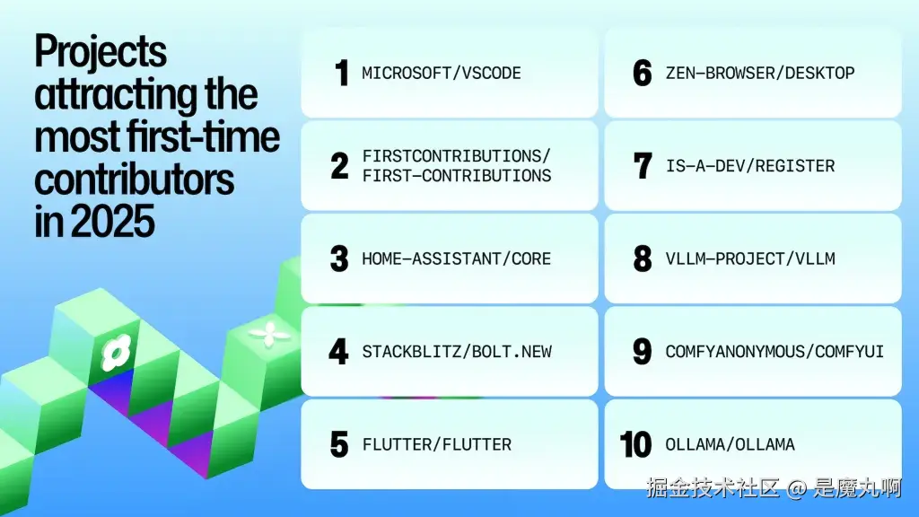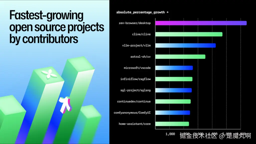 生成式 AI 项目继续成为 GitHub 上最受欢迎的项目。像 vllm、ragflow 和 ollama 这样的项目超越了 vscode、home-assistant、flutter 等主要项目的历史贡献者增长。