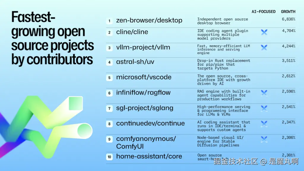10 个增长最快的仓库中有 6 个是 AI 基础设施项目,强调了对运行时、编排和效率工具的需求。