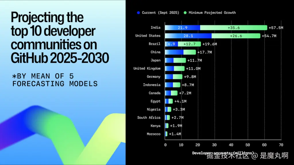 值得注意的是,非洲和中东的新兴地区显示出势头,埃及、尼日利亚、肯尼亚和摩洛哥都预计在未来几年增加数百万开发者。这指向一个不仅增长而且在地理上以前所未有速度多样化的开发者人口。